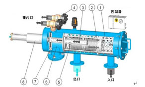 水力驅動自清洗過濾器由主管組件、端蓋組件、細濾芯組件、粗濾芯組件、吸污器組件、水力馬達、水力缸組件、排污閥、管路控制系統(tǒng)等主要零部件組成。水由入水 口進入過濾器,首先經過粗濾芯組件濾掉圈套顆粒的雜質,然后到達細濾網,通過細濾網濾除細小顆粒的雜質后,清水由出水口排出。